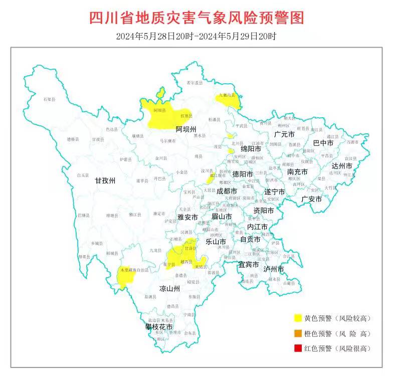 5月28日,记者从四川省当然资源厅获悉,把柄四川省征象台天气预告情况,采集四川省地质环境条目,5月28日20时至5月29日20时,全省地质灾害征象风险预警恶果如下: