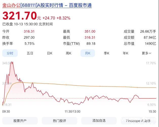 或受此音讯影响,终结10月13日A股收盘,金山办公股价涨8.32%,报收321.70元,总市值1490.05亿元。