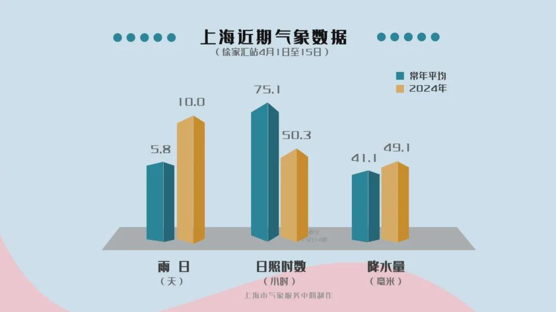4月过半,和终年同时比拟,本年的暗淡天气超多。4月1日至15日的半个月中,雨日有10天,接近终年同时平均的2倍,属于颠倒偏多;总日照数仅有终年平均的60%;总雨量不大,比终年平均略多。