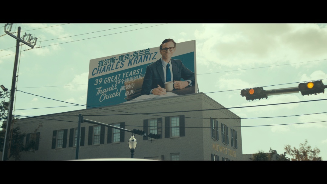 一幅写有“39个岁月峥嵘,谢谢你,查克!”的告白牌,在寻常巷陌和电视频说念上频频出现,而告白词的摆布,恰是“抖森”汤姆·希德勒斯顿扮演的主东说念主公查克。吊诡的是,包括马蒂在内的统共东说念主,皆对查克一无所知。