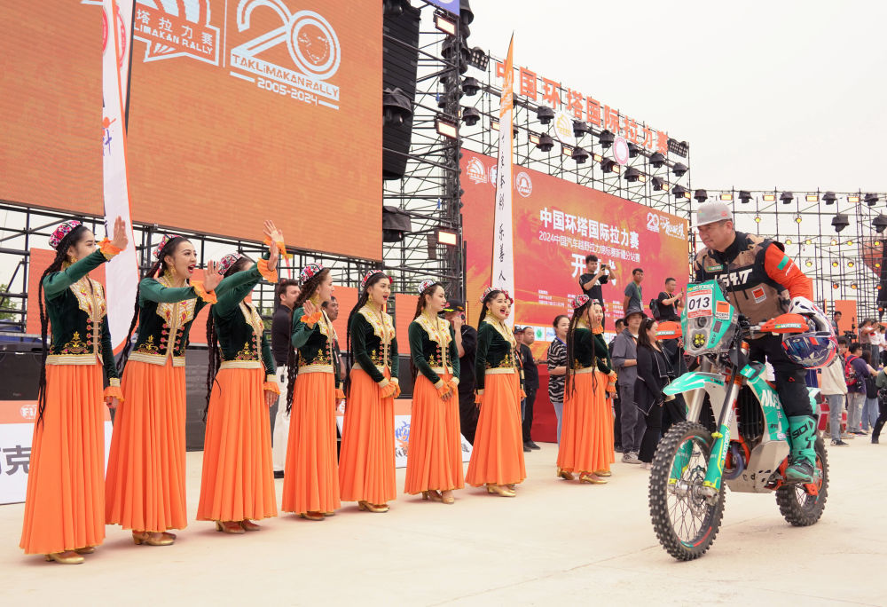 5月20日,在2024中国环塔国外拉力赛开幕式上,跳舞演员们为MOTOREX-KTM骑士学院车队车手加油。新华社记者 张啸诚 摄
