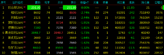 2024年5月15日,期市早盘开盘,国内期货主力合约多量着落。锰硅跌超3%,纯碱、菜油跌超2%,氧化铝、棕榈油跌近2%。涨幅方面,沪锡、沪铅涨超1%。